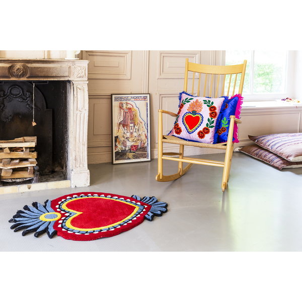 Este cojín rosa con flecos de terciopelo tiene un corazón bordado, inspirado en el corazón mexicano de Milagros. El cojín Milagros tiene un tamaño de 45x45 cm y se entrega con relleno incluido. El cojín tiene una cremallera en la parte trasera.