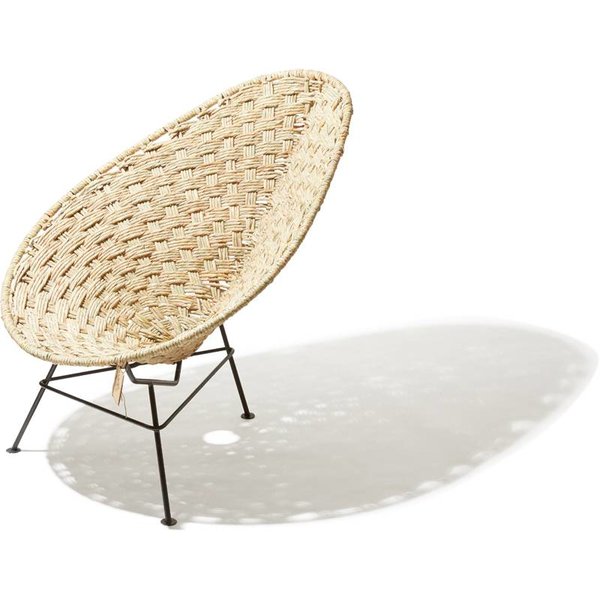 Materiales: El asiento esta tejida a mano con caña natural de origen local (Schoenoplectus acutus). La base está hecha de acero galvanizado y pintura en polvo.