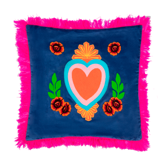 Ce coussin à franges en velours possède un cœur brodé, inspiré du cœur mexicain Milagros. Le coussin Milagros a une taille de 45x45 cm et est fourni avec le rembourrage. Le coussin a une fermeture éclair à l'arrière.