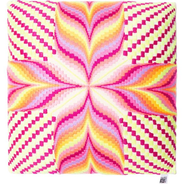 Les housses de coussin Dilván sont brodés à la main par les femmes de la communauté mexicaine Zacualpan. Notable sont les formes géométriques et des motifs colorés.