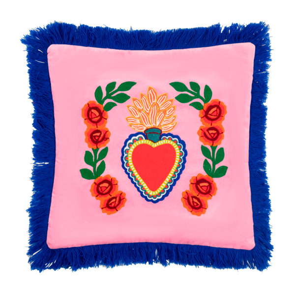 Questo cuscino rosa con frange in velluto ha un cuore ricamato, ispirato al cuore messicano Milagros. Il cuscino Milagros ha una dimensione di 45x45 cm e viene fornito comprensivo di imbottitura. Il cuscino ha una cerniera sul retro.