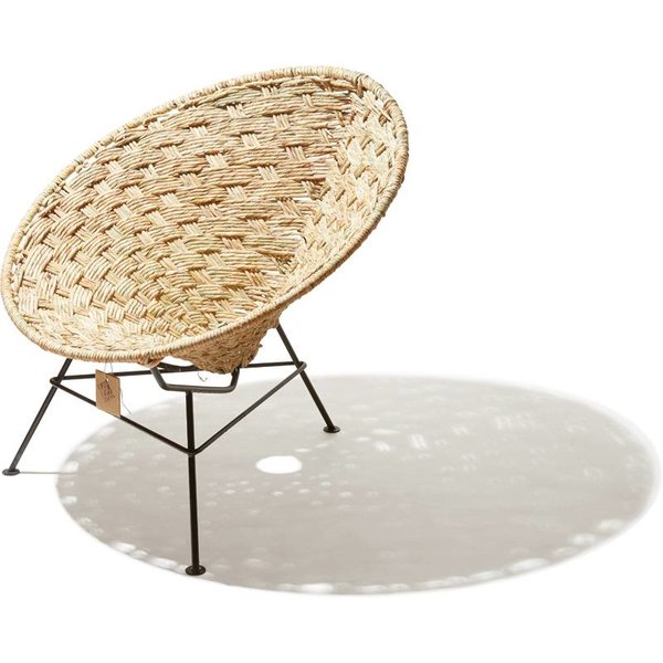 Materiali: Il sedile è completamente fatto a mano con canna naturale ottenuta localmente (Schoenoplectus acutus). La base è in acciaio zincato e verniciato a polvere.
